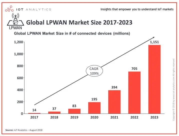 據預測,2017年至2023年LPWAN設備部署將大幅增長(如上圖所示),這表明LoRaWAN是物聯網連接領域快速增長的一部分,其中還包括快速增長的智能建筑市場。