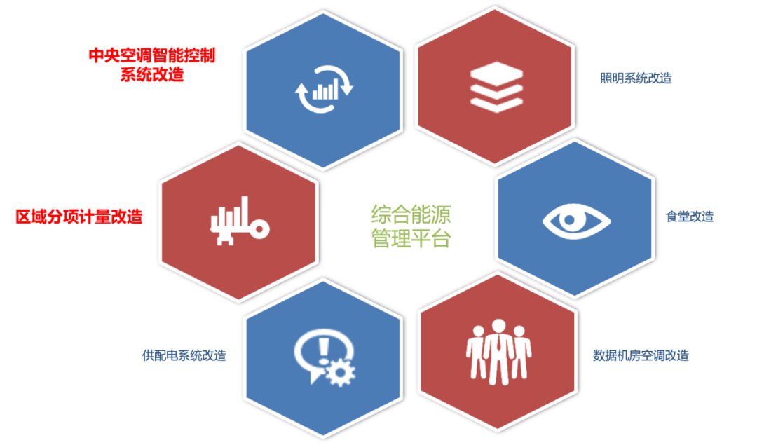 一期E座和二期ABCD座,合計改造面積26.6萬平。分為:水、電、燃氣的分戶分項計量,中央空調(diào)的智能控制,智能照明系統(tǒng),供配電系統(tǒng)智能化監(jiān)控,食堂改造,數(shù)據(jù)機房空調(diào)改造,綜合能源管理平臺建設(shè)等7個部分。