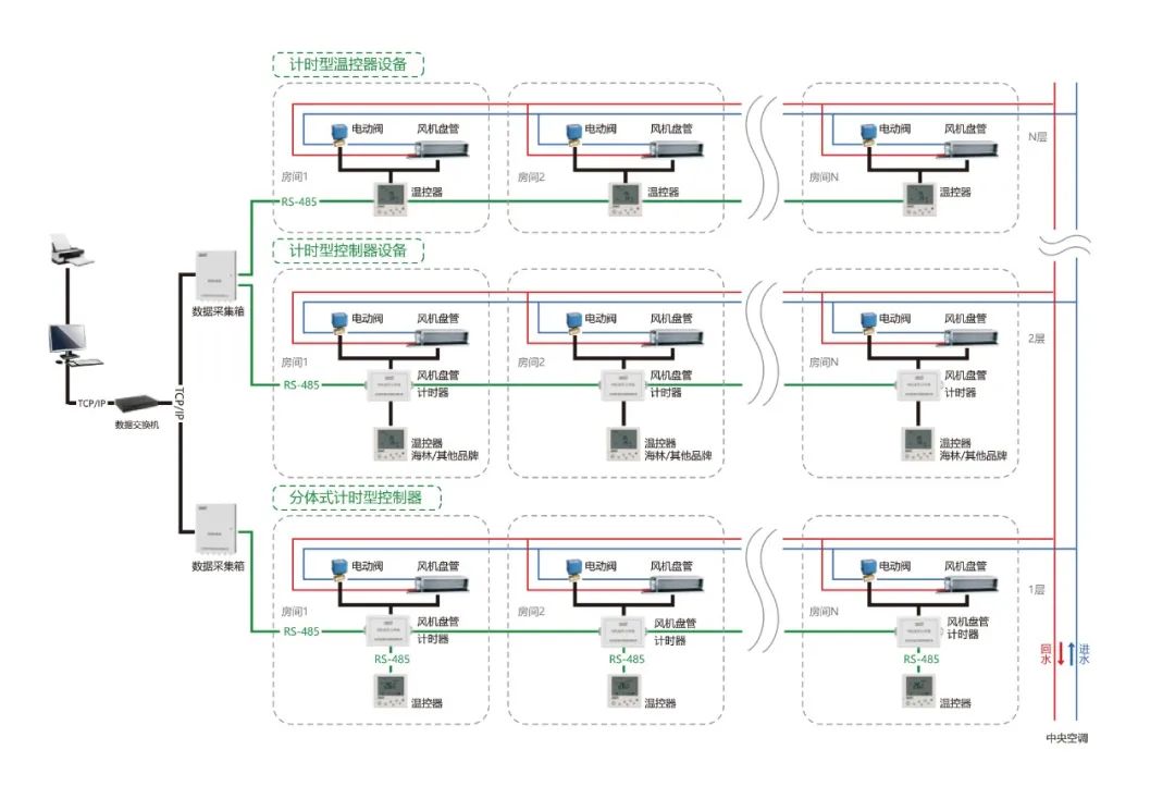 海林HNTS末端溫控器集控系統集自動化控制技術、計算機網絡技術于一體,可同時集中或獨立對多臺末端設備的啟停、水閥的開閉及溫度設置進行控制。有三種聯網集控方式:RS-485 有線方式、 LoRa 無線方式和 Wi-Fi 無線方式。