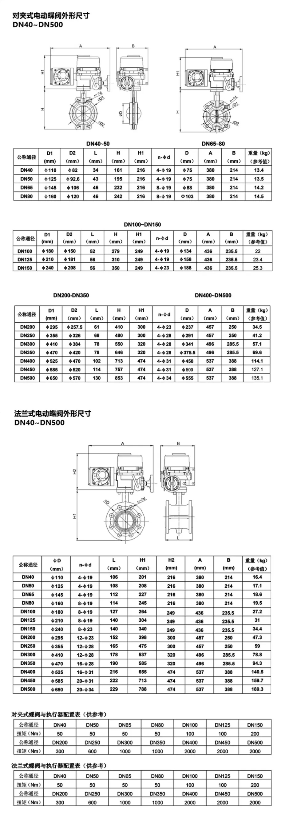 以下為海林對夾式和法蘭式電動蝶閥的工程尺寸和相關重要參數。