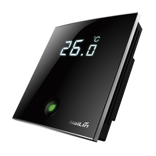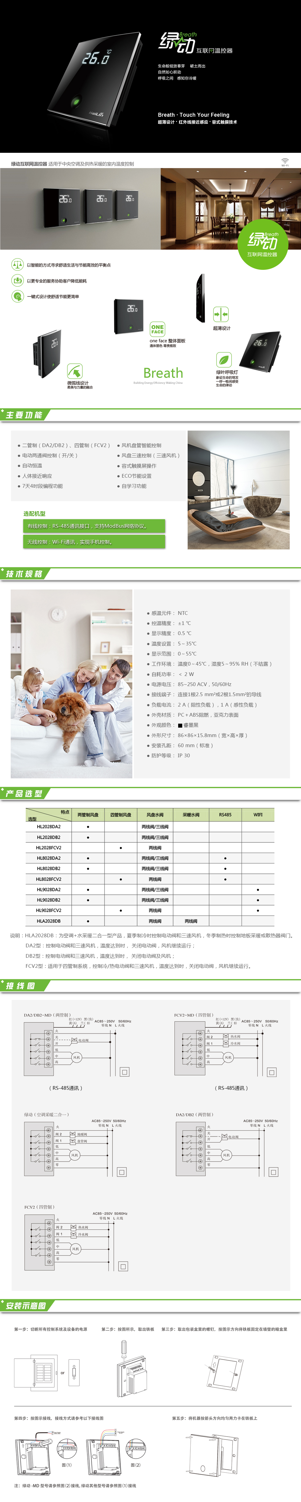 綠動空調溫控器包括“本地控制、有線控制、無線控制”三種類型,適用于中央空調風機盤管系統或風管道系統,自動調節室內溫度。微弧線曲面設計彰顯柔美與力量融合,面板整體睿墨含蓄尊貴雅致,綠葉呼吸燈時尚點綴,如呼吸間感受生命律動,象征生命萌發。